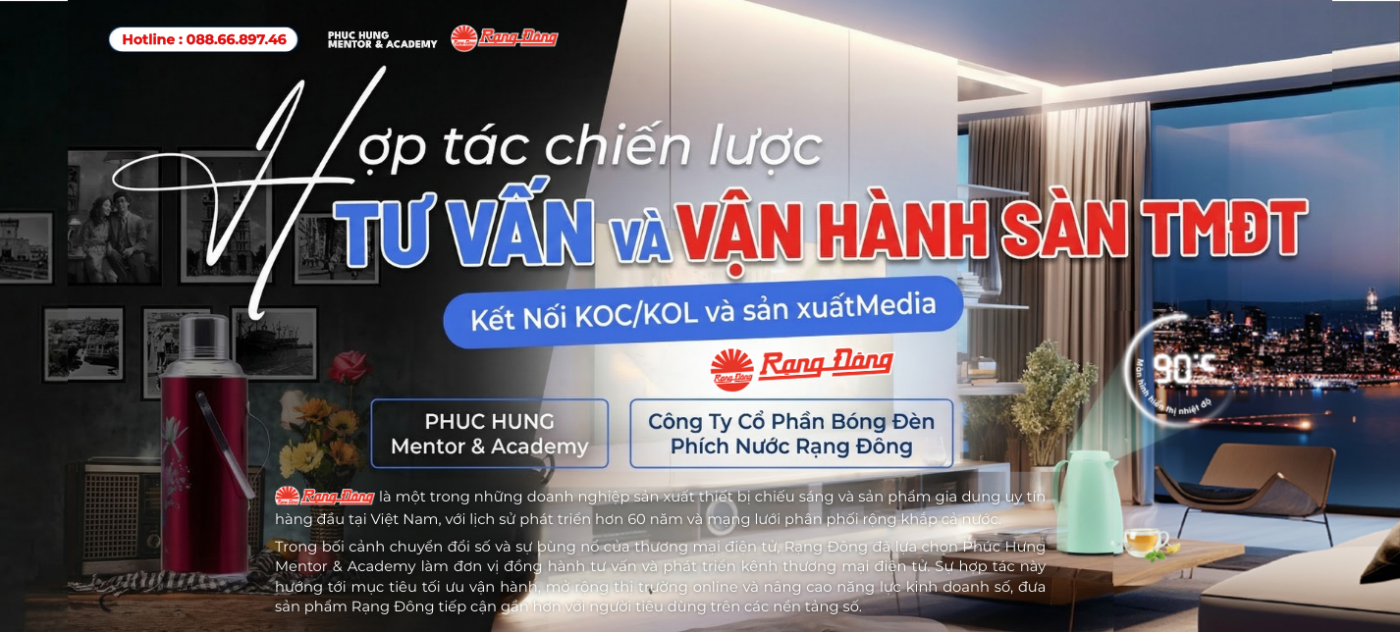 Trong bối cảnh chuyển đổi số đang diễn ra mạnh mẽ trên toàn cầu, thương mại điện tử trở thành một trong những kênh tăng trưởng quan trọng của nhiều doanh nghiệp sản xuất. Nắm bắt xu thế đó, Công ty Cổ phần Bóng đèn Phích nước Rạng Đông – thương hiệu quốc gia với hơn 60 năm phát triển trong lĩnh vực thiết bị chiếu sáng và sản phẩm gia dụng – đã chính thức hợp tác cùng Phúc Hưng Mentor & Academy để tư vấn và triển khai chiến lược phát triển thương mại điện tử.